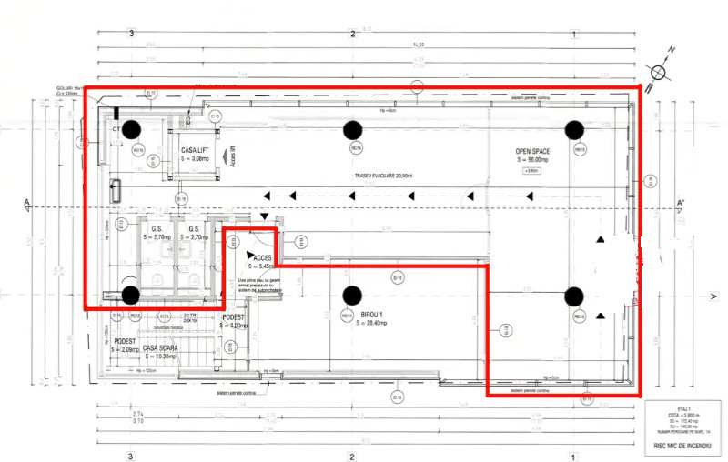 Suprafață de 164,47 mp. este compusa din 144,48 mp. (spațiu util pentru birouri și grupuri sanitare) si 19,99 mp. (cotă parte aferentă suprafeței utile etajului 1 pentru utilizarea spațiilor comune ale cladirii ). Beneficiaza de două grupuri sanitare separate femei /bărbați, precum și cu o bucătărie/oficiu.