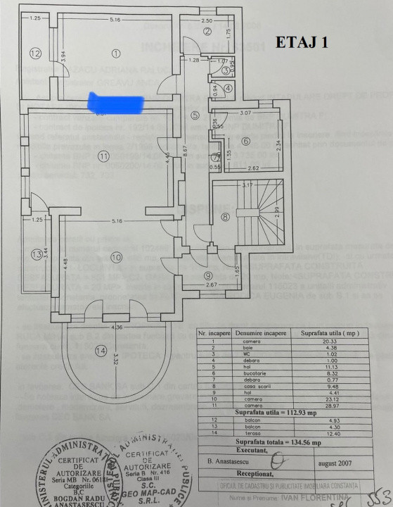 - etajul 1 - 135 mp. (suprafata utila 113 mp.) - 3 camere, bucatarie, grupuri sanitare, 2 balcoane si terasa;