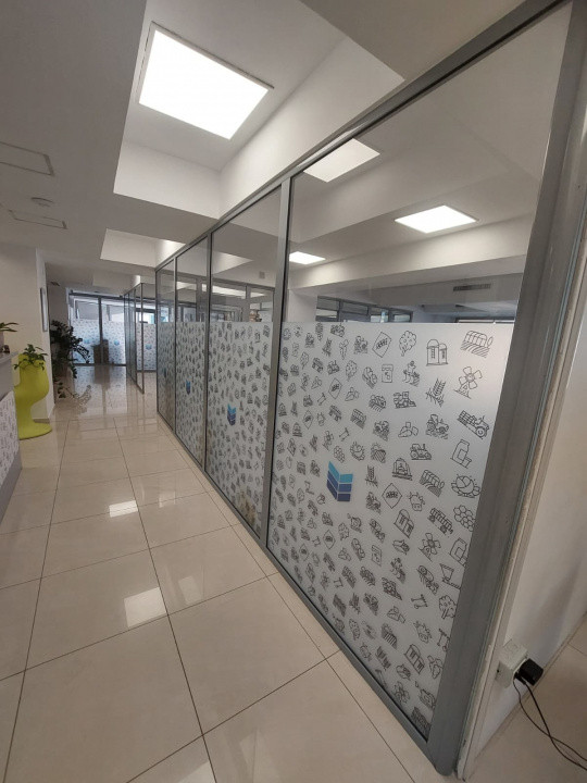 Spatiile sunt compartimentate cu pereti vitrati sau tip RIGIPS si este racordat la standardele tehnice internationale.