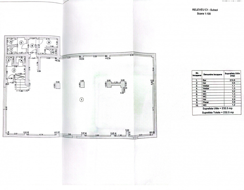 Spatiul , cu o suprafata totala utila de 232 mp., se afla la demisol, dispune de 2 intrari, 3 grupuri sanitare, curent trifazic, sistem ventilatie, acces facil, deshidere la strada, posibilitate reclama mare, vizibilitate totala acces spatiu. Accesul in spatiu se face din strada, intrare mare / deschisa. Spatiul este open space si poate fi compartimentant dupa bunul plac, momentan este compartiment cu pereti de rigips ce pot fi daramati usor.